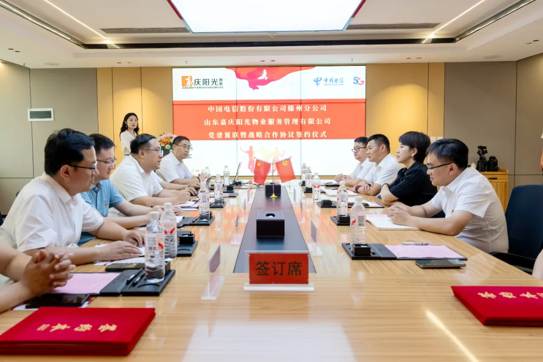 6月10日,山东嘉庆阳光物业服务管理有限公司与中国电信股份有限公司滕州分公司携手签订党建翼联暨战略合作协议,开启了双方深度合作、共赢发展的崭新篇章。枣庄电信副总经理高洋;全渠道运营中心副主任陈恒忍;滕州电信支部书记、总经理秦广磊;副经理李海峰、张新伟;行业经理李东东;云中台主任涂永坤;山东嘉庆阳光物业服务管理有限公司总经理刘娟;常务副总经理、住宅事业部总经理孙垒;副总经理、商业事业部总经理牛超;增值服务部经理徐国营;党支部书记闫丽艳;项目负责人代表参加活动。